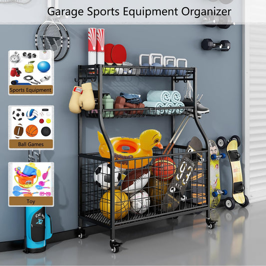 Linzinar Garage Sports Equipment Organizer Ball Rack Rolling Sports Gear Storage Car